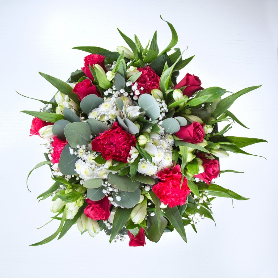 This luxurious bouquet embodies refined radiance and exceptional artistry. A balanced fusion of vivid red roses and sparkling white chrysanthemums creates a captivating sight, perfectly enhanced by tender carnations and gentle gypsophila. Accents of white alstroemeria and aspidistra leaves complete this sophisticated floral design, making it a standout gift.