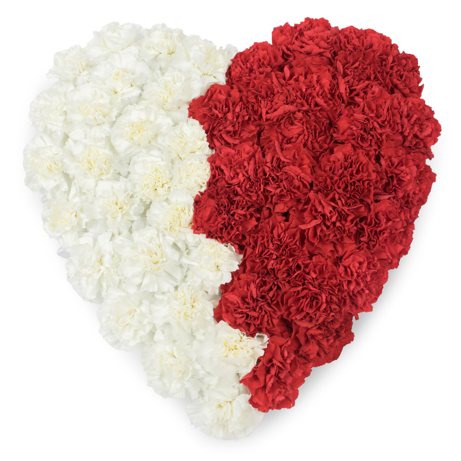 Celebrate your heartfelt moments with our splendid heart-shaped bouquet, thoughtfully arranged by Handy Flowers. This elegant arrangement showcases a refined mix of white and red carnations, perfect for expressing sympathy, love, and deep emotions.