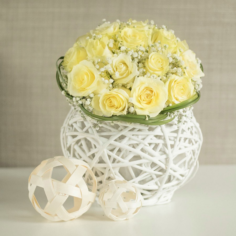 Yellow contrasts with white very well. The whole wedding table was with white decorations (tablecloth,table napkins, tableware, dinner set, etc. ) and I advised my sister to choose the yellow roses. They were perfect for the atmosphere ( we were also on the beach afterwards). So I highly recommend this color with this arrangement.